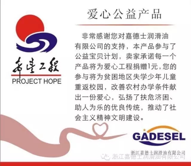 非常感謝您對嘉德士潤滑油有限公司的支持,本公司所有產品參與了公益寶貝計劃,我們承諾每一個產品將為愛心工程捐贈1元,您對參與將為貧困地區失學少年兒童重返校園,弘揚了扶危濟困、助人為樂的優良傳統,推動了社會主義精神文明建設。
